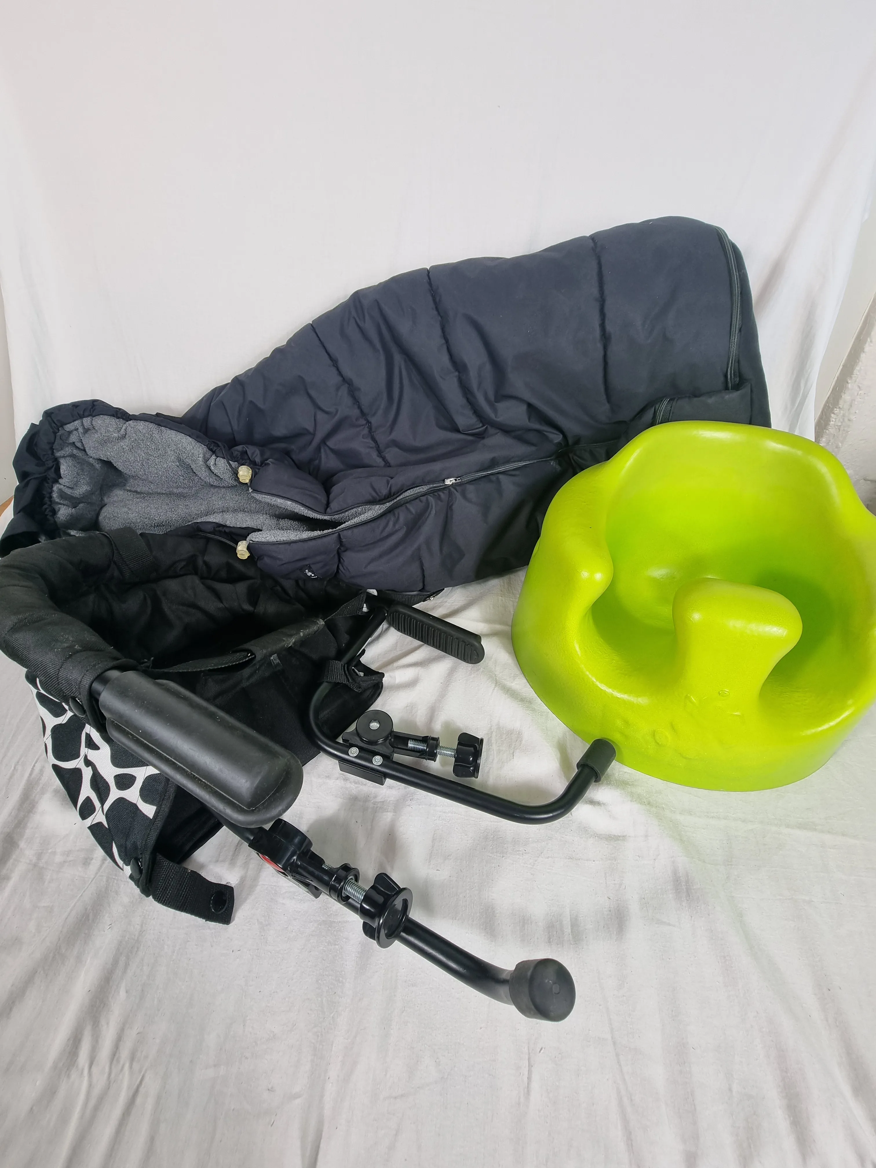 Åkpåse, bumbo och barnstol som fästes i bord.