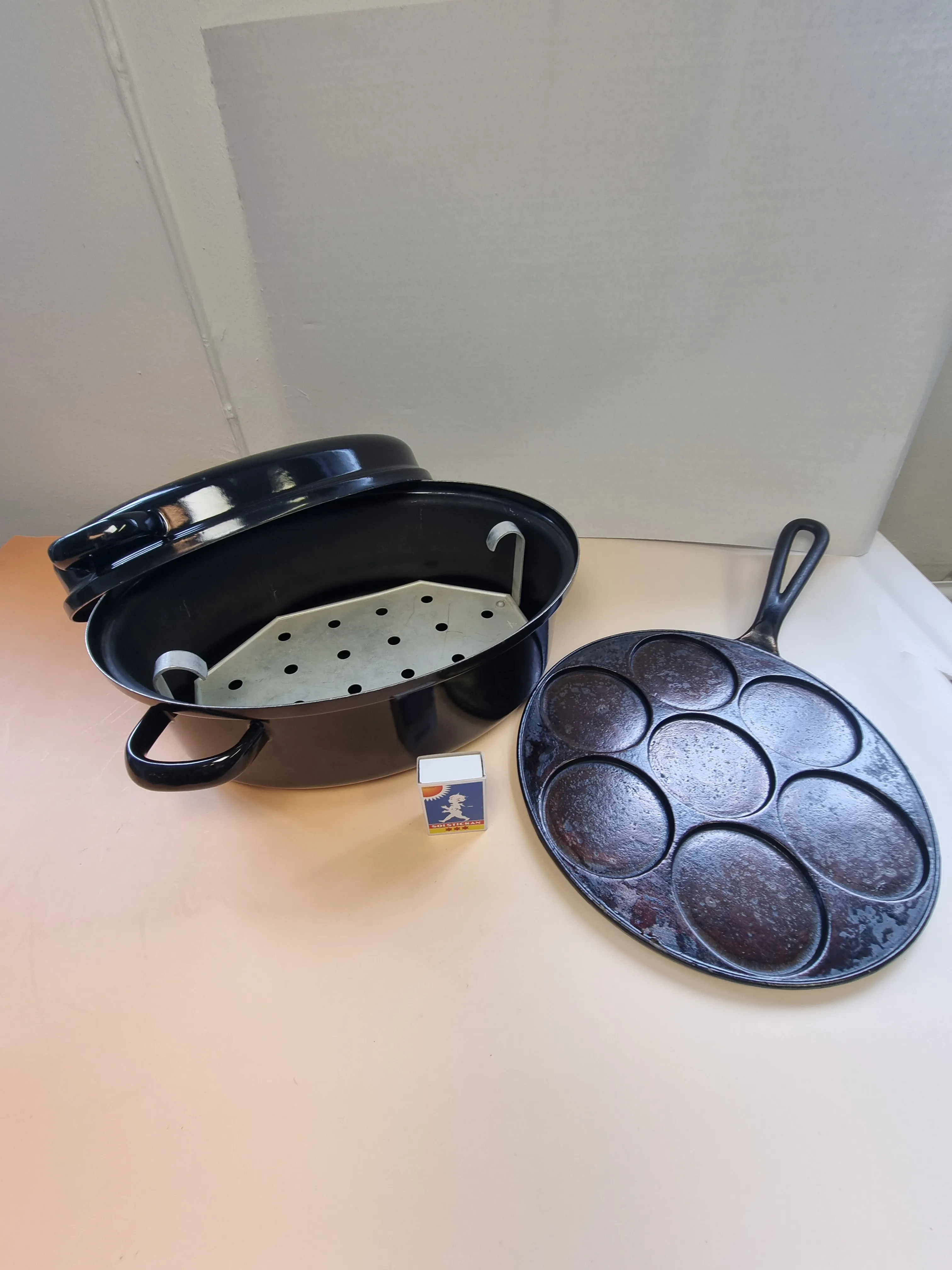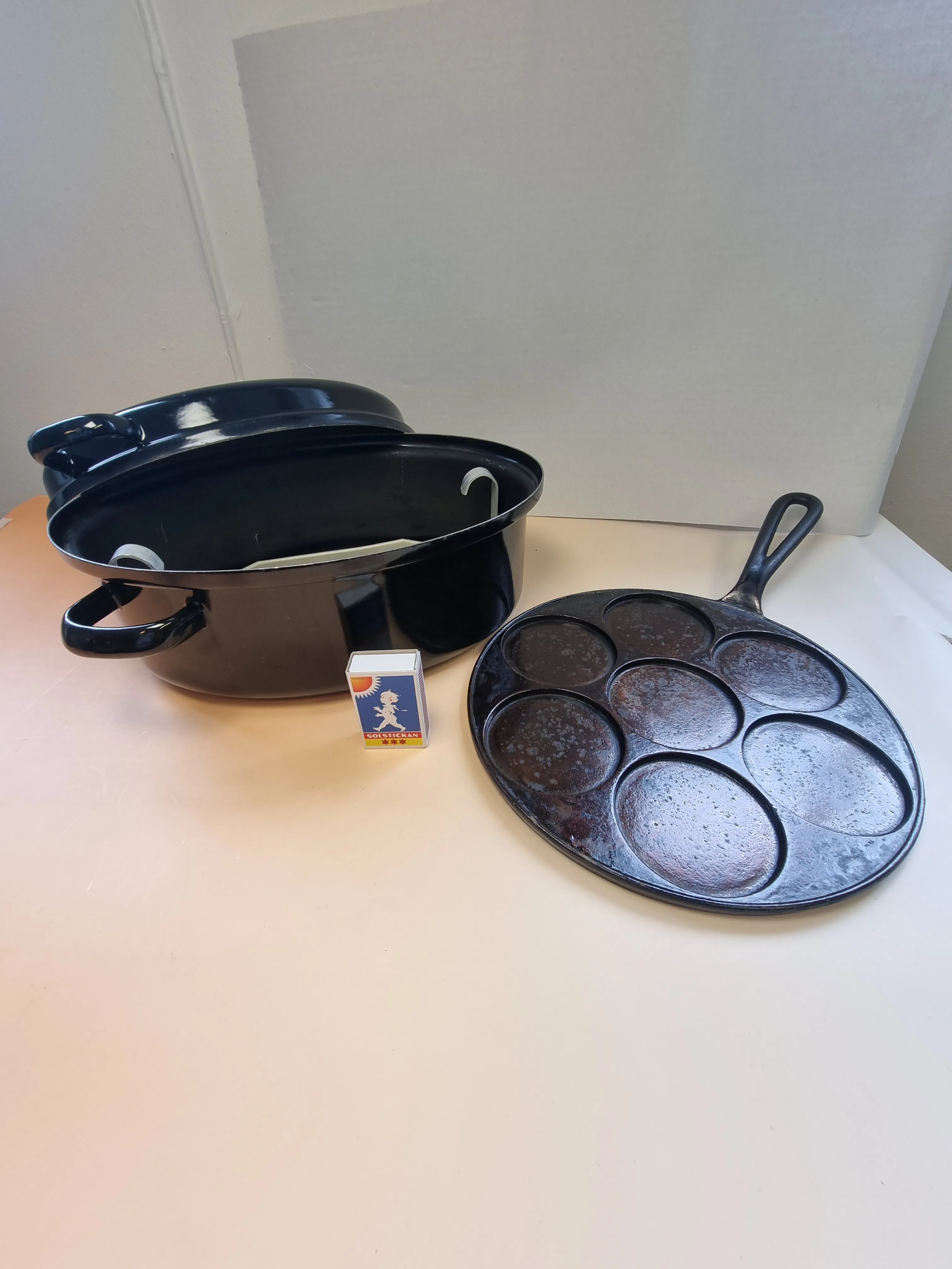 Gryta i emalj samt plättlagg i gjutjärn