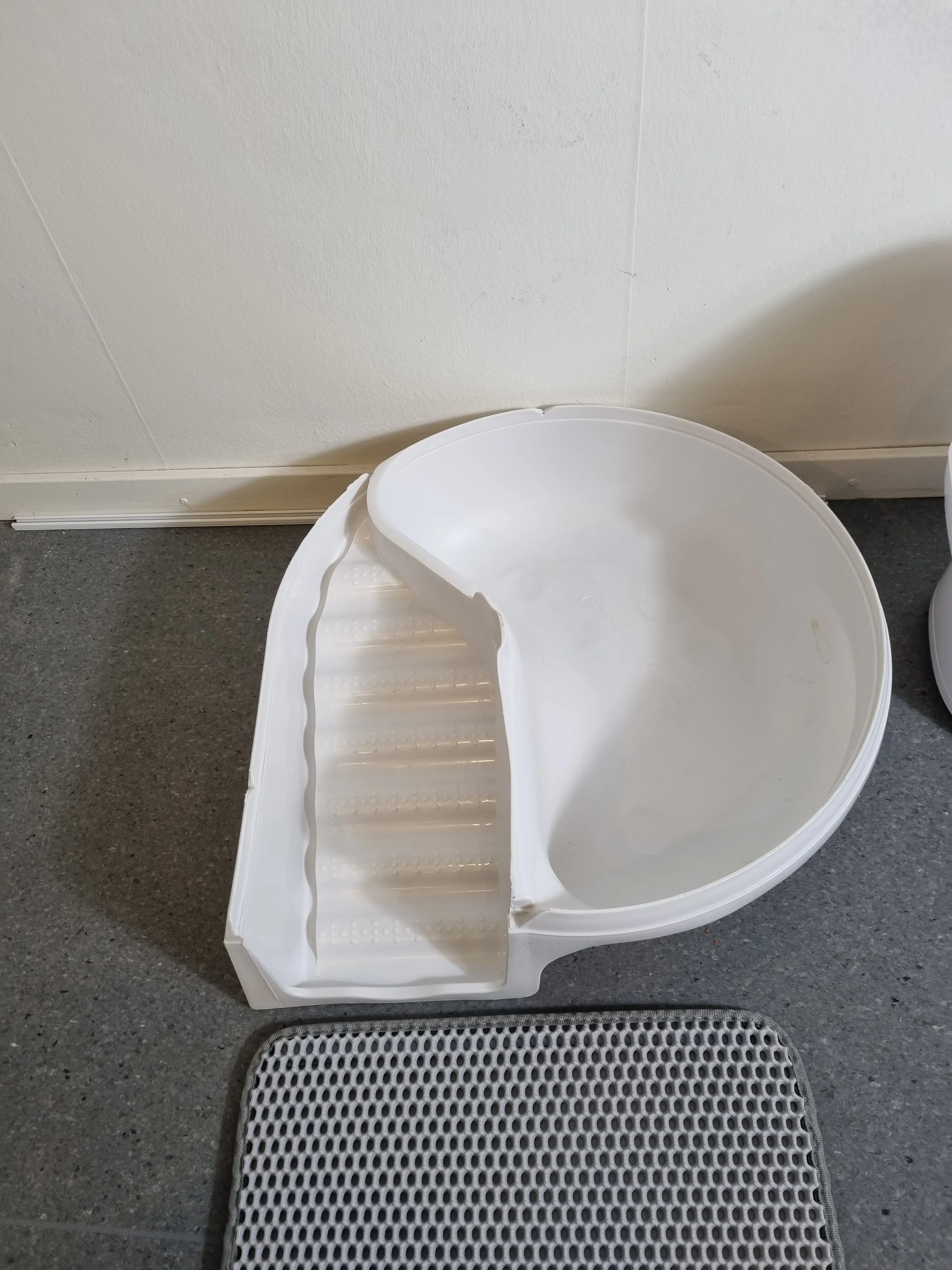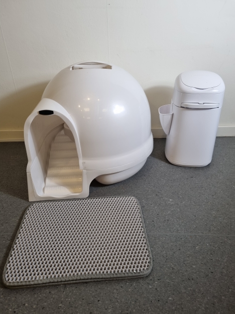 kattlåda med annorlunda design, med en liten trappa så katterna får bort sanden innan de kliver ur.