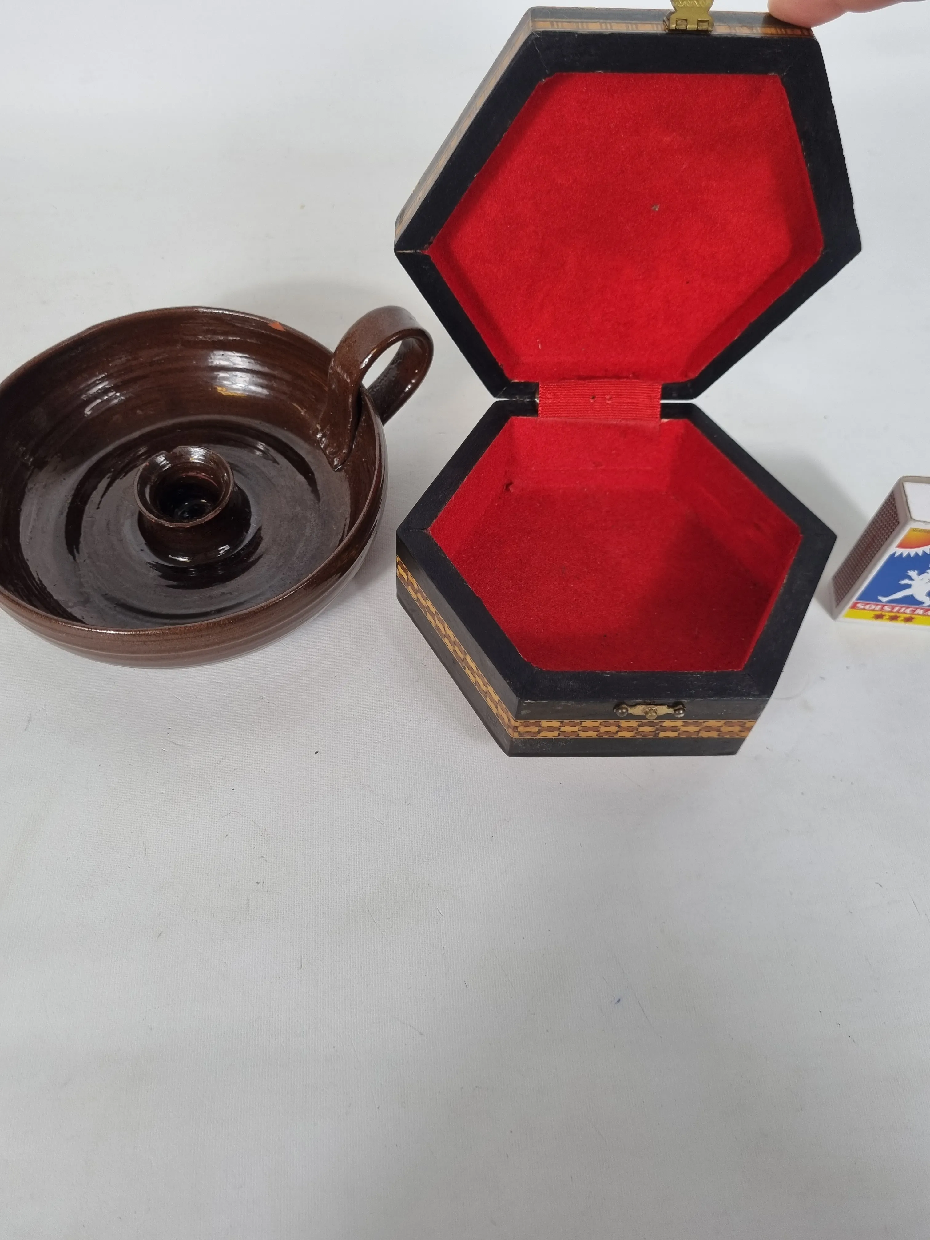 126. Ljusstake i keramik samt en träask