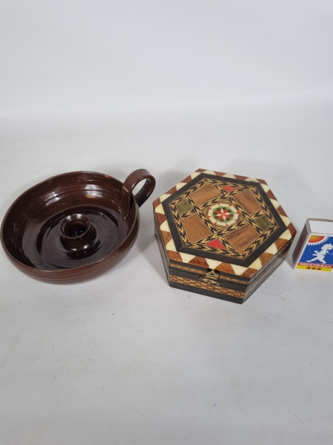 Ljusstake i keramik samt en träask